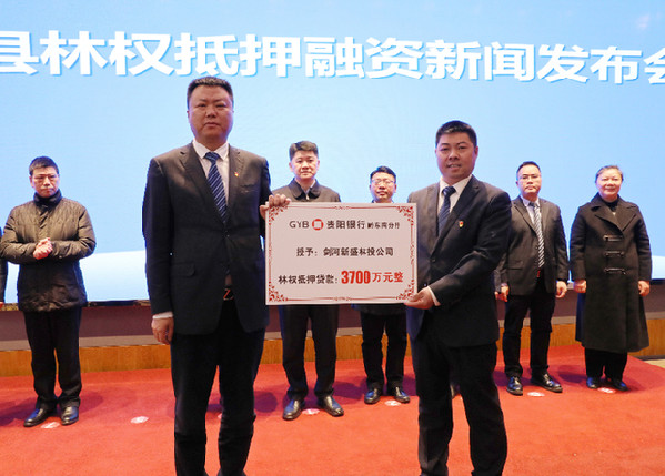 1月29日,在貴州省劍河縣林權抵押融資新聞發布會現場,貴陽銀行黔東南分行向劍河縣新盛林業投資開發有限責任公司投放黔東南州第一筆林權抵押貸款,授信3700萬元。