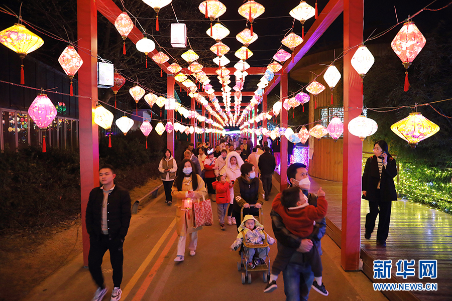 1月29日晚,游客在蓬萊仙界·蘑力小鎮賞燈。新華網 盧志佳 攝