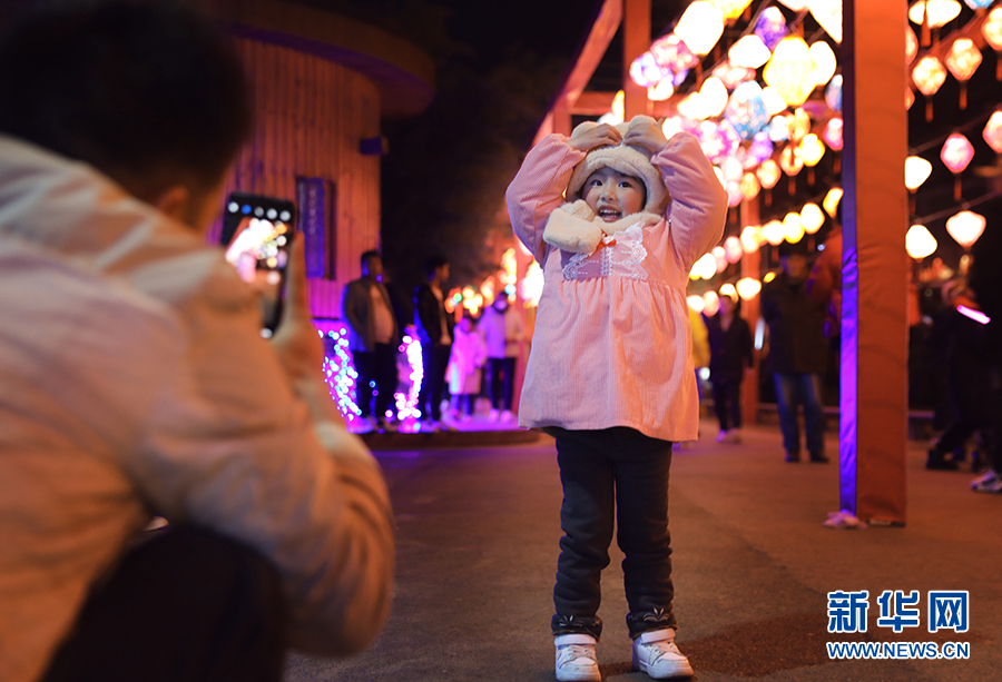 1月29日晚,游客在蓬萊仙界·蘑力小鎮內的綵燈前“打卡”。新華網 盧志佳 攝