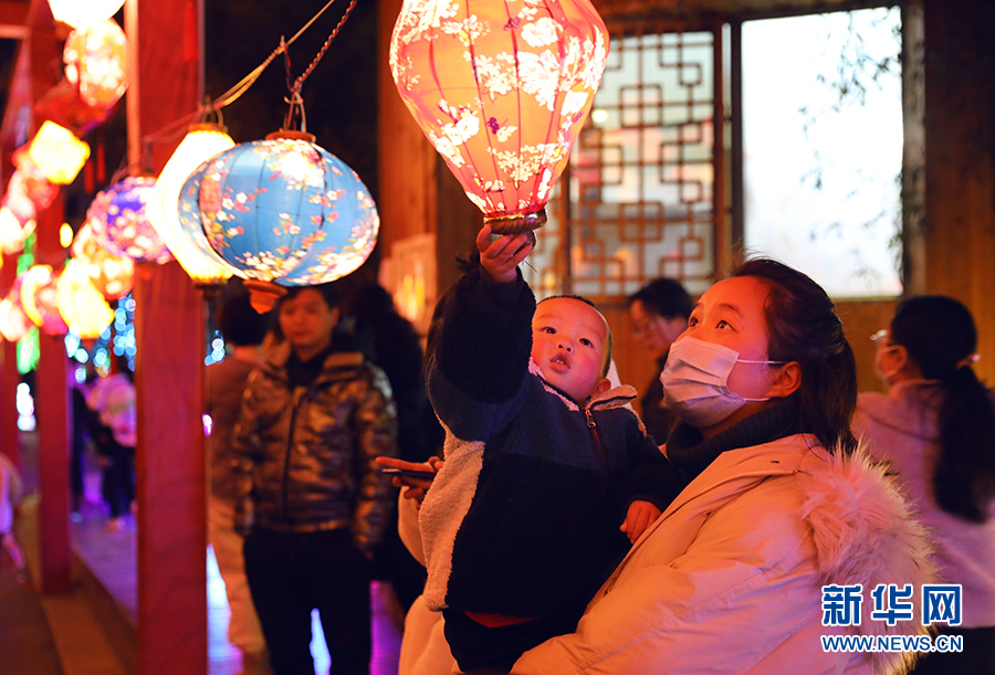 1月29日晚,游客在蓬萊仙界·蘑力小鎮賞燈。新華網 盧志佳 攝