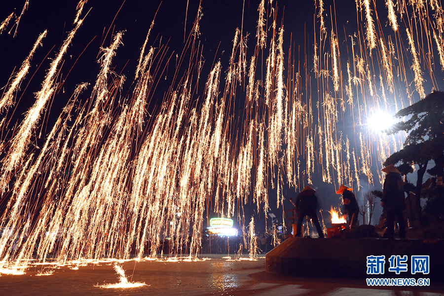 1月29日晚,貴陽市白雲區蓬萊仙界·蘑力小鎮內進行非遺項目打鐵水錶演。新華網 盧志佳 攝