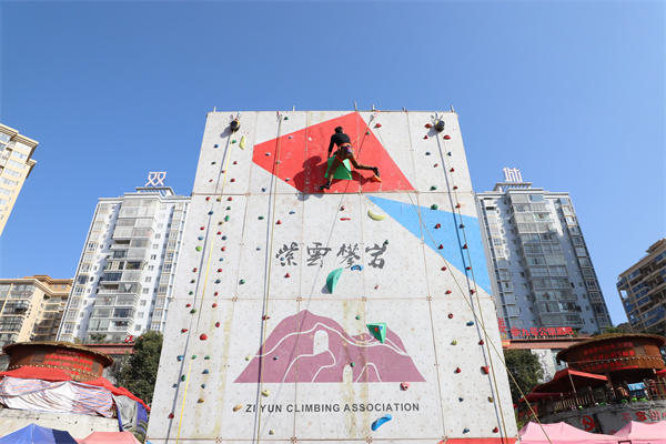 連日來,在紫雲自治縣亞魯王文化廣場,人潮涌動,熱鬧非凡。游客裏三層、外三層地圍觀精彩、驚險、刺激的攀岩體驗活動,喝彩聲、尖叫聲、歡呼聲、掌聲不絕於耳。紫雲10多年來一直持續成功舉辦國際攀岩挑戰賽。紫雲擁有獨一無二的“蜘蛛人”徒手攀岩文化,攀岩技藝的省級代表性傳承者“蜘蛛人”在格凸河景區徒手攀岩,為廣大游客展示獨特攀崖技藝,讓中外游客嘆為觀止。受傳統徒手攀岩文化的影響,當地人比較喜歡這一戶外挑戰運動。為滿足廣大人民群眾的運動需求,今年紫雲在新春文體系列活動中增加了攀岩體驗活動。