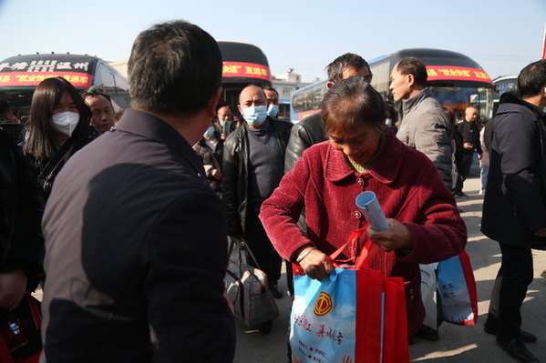 返崗復工農民工馮江軍高興地説:“政府送我們大禮包,讓我感覺心裏面很溫暖,同時也謝謝政府,我準備掙大錢回來。”
