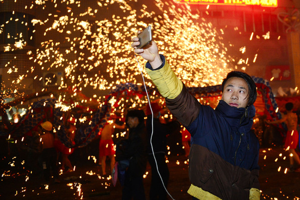 正月初十,游客與“勇敢者的游戲”舞龍噓花自拍留念。張強 攝
