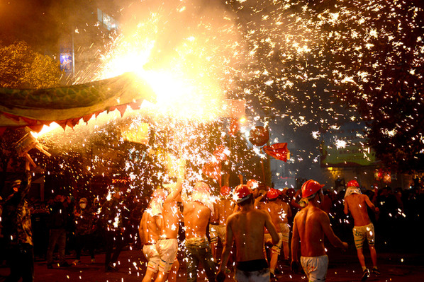 正月初十的夜晚,舞龍的“勇士”在數只噓花筒下闊步前行。張強 攝