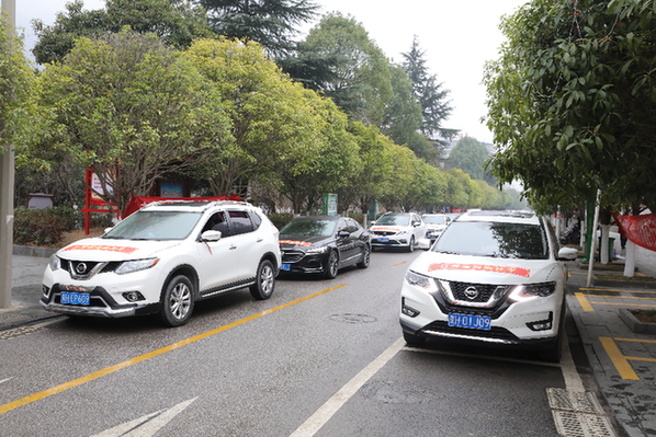 駕駛員們正在參加自助返崗油補車發車儀式