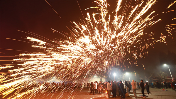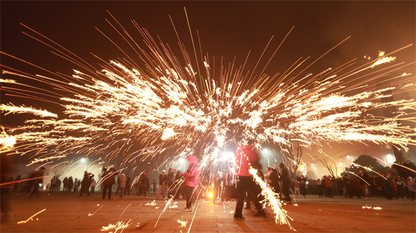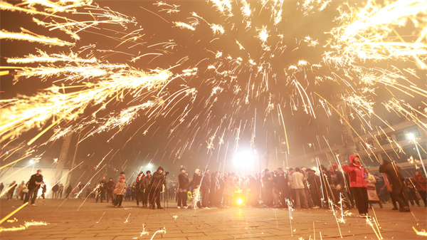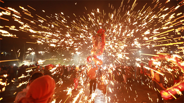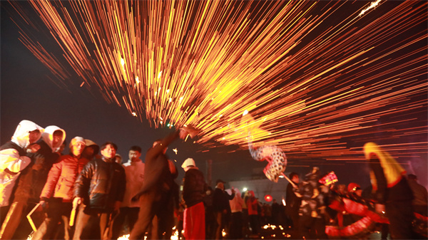 2月5日,在貴州省大方縣六龍鎮舉行的舞龍祈福迎新活動中,“打鐵花”表演吸引了游客駐足圍觀。活動現場,燒紅的鐵水在木板等工具的打擊下,鐵花飛濺,流星如瀑,加上周圍的煙花齊鳴,給春節注入了濃濃的年味。(周訓貴)