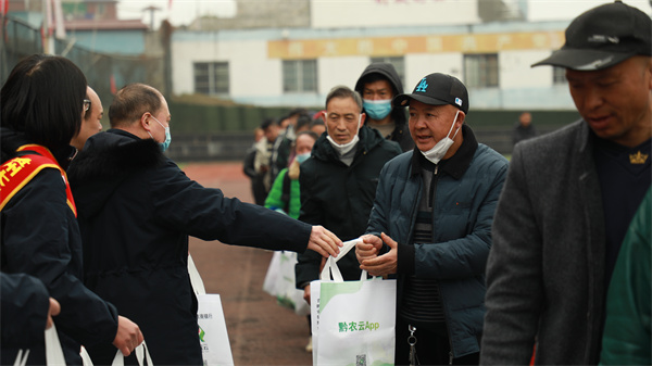 2月6日,大方縣農商銀行工作人員為返崗農民工發放禮包。周訓貴 攝