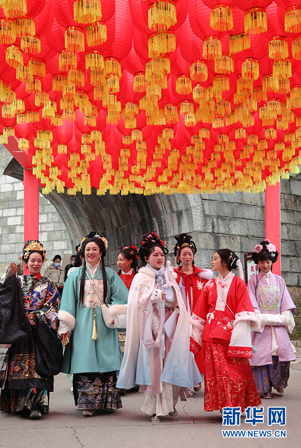 2月5日,身穿漢服的貴陽市民行走在貴陽市文昌閣元宵節廟會活動現場。