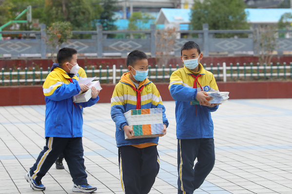 2月13日,在貴州省黔東南苗族侗族自治州劍河縣城關第一小學,小學生領到新課本。