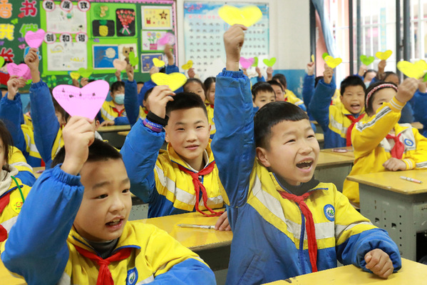2月13日,在貴州省黔東南苗族侗族自治州劍河縣城關第一小學,學生在開學第一課上展示新學期心願卡片。 (楊家孟 攝)