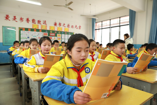2月13日,在貴州省黔東南苗族侗族自治州劍河縣城關第一小學,六(9)班的小學生在課堂上朗讀課文。