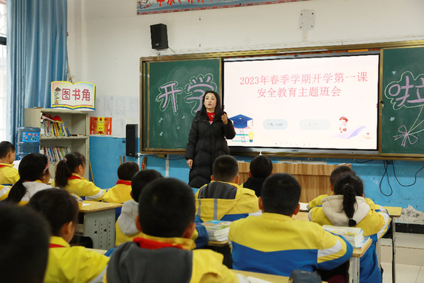 2月13日,在貴州省黔東南苗族侗族自治州劍河縣城關第一小學開學第一課上,老師在給學生講解安全知識。(楊家孟 攝)