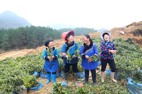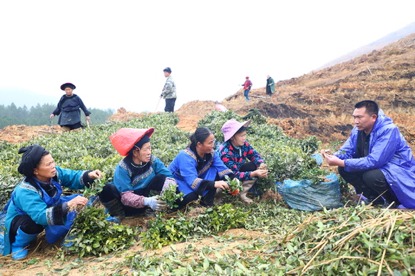 “我們來唱一首歌,感謝黨的好政策;黨和國家政策好,引進産業種茶苗;荒山綠了能致富,子孫後代很幸福……”茶苗栽種現場,大家有説有笑,聊聊家鄉的發展變化,聊到動人處,水族婦女還即興唱起了水歌,感謝黨和國家的好政策。