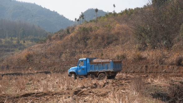 岑鞏縣羊橋鄉祝壩村陸家灣組雜交水稻制種基地,工程車向新修的溝渠運送施工材料。(周燕 攝)