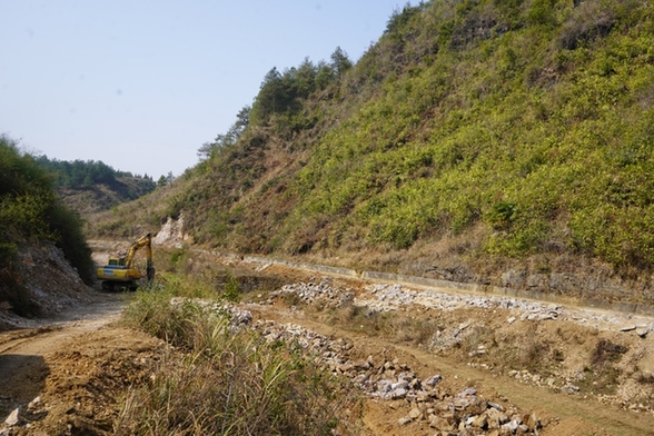 岑鞏縣羊橋鄉祝壩村黃虎坡組,挖掘機在碎石作業,為老舊溝渠翻修準備施工材料。(周燕 攝)