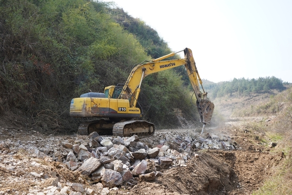 在該鄉祝壩村黃虎坡組,挖掘機正在進行碎石作業,為翻修老舊溝渠準備石材。