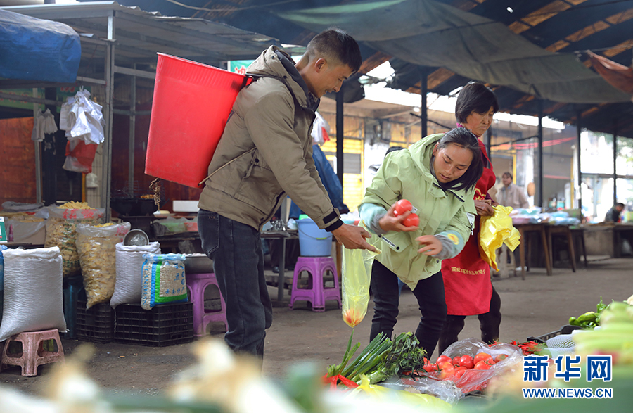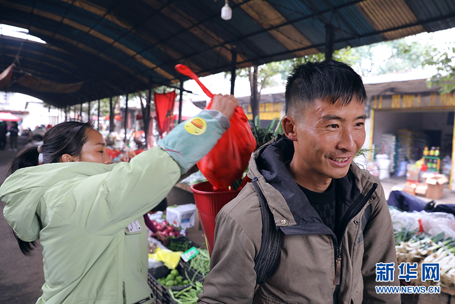 2月18日,小馬哥夫婦倆在都格鎮上的菜市場買菜。新華網 盧志佳 攝