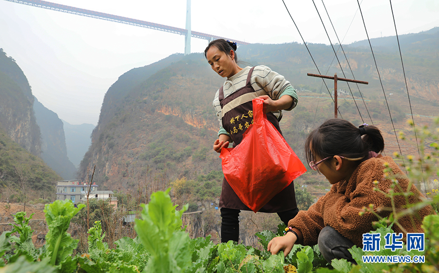 2月18日,李畢美帶着女兒在菜地裏摘青菜。新華網 盧志佳 攝