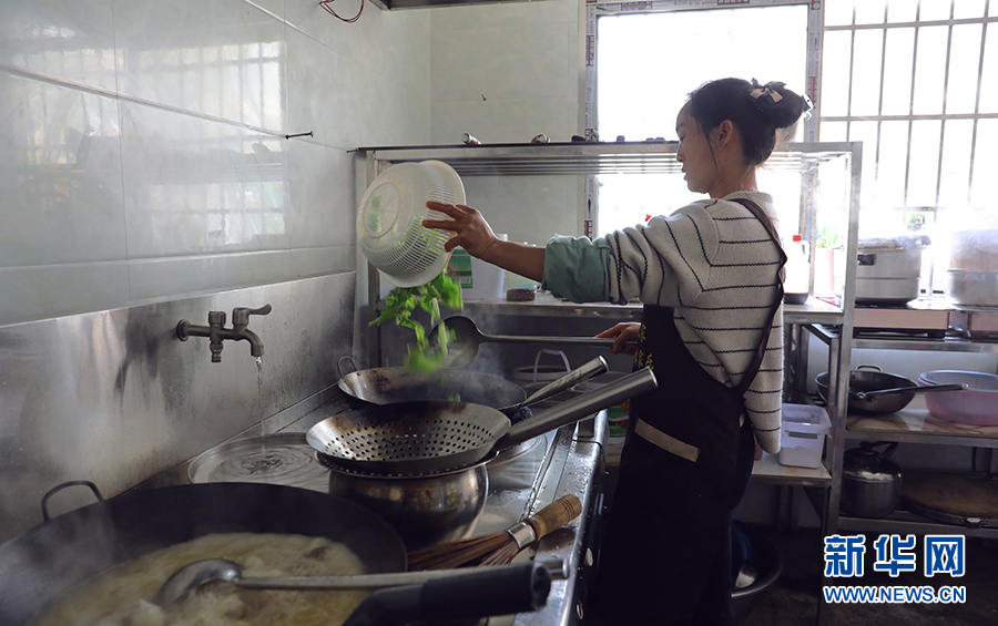 2月18日,李畢美在廚房炒菜,當天有兩桌客人來她家用餐。新華網 盧志佳 攝