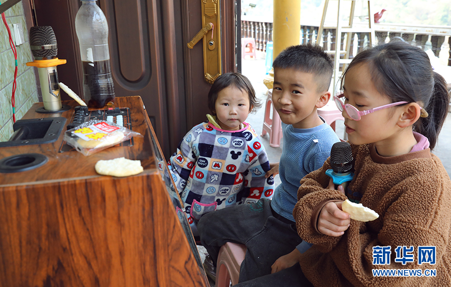 2月18日,小馬哥的子女和侄女在家中的卡拉OK機上唱歌。新華網 盧志佳 攝