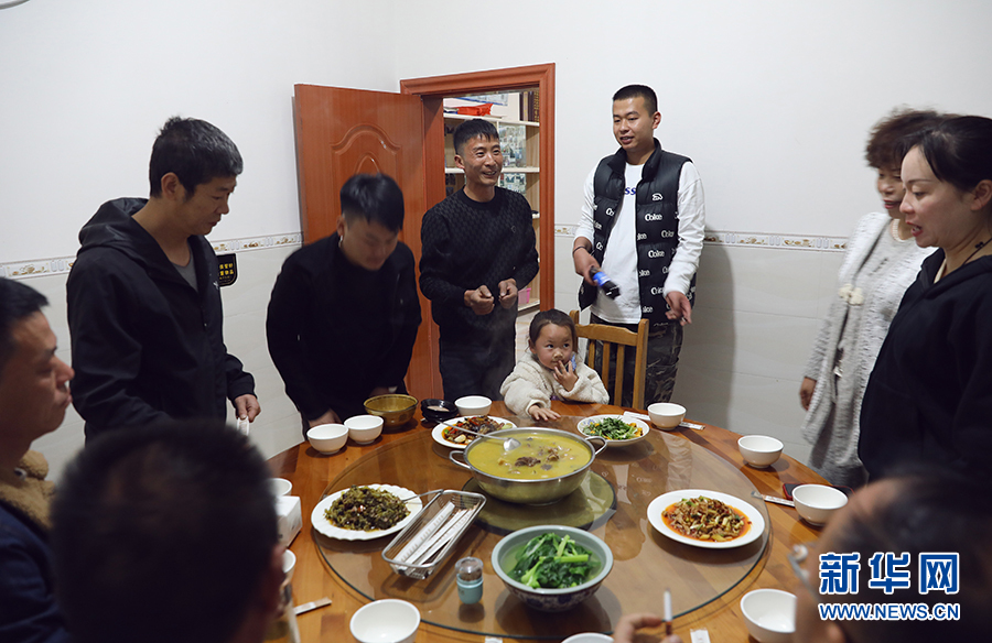 2月18日,小馬哥一家人在家中陽&上吃午飯。小馬哥一邊吃飯,一邊給兩個孩子講北盤江大橋的知識。新華網 盧志佳 攝
