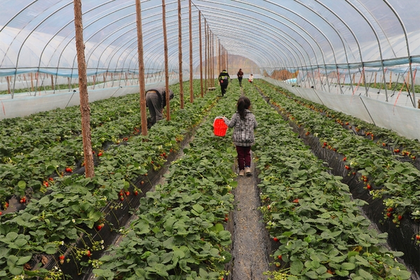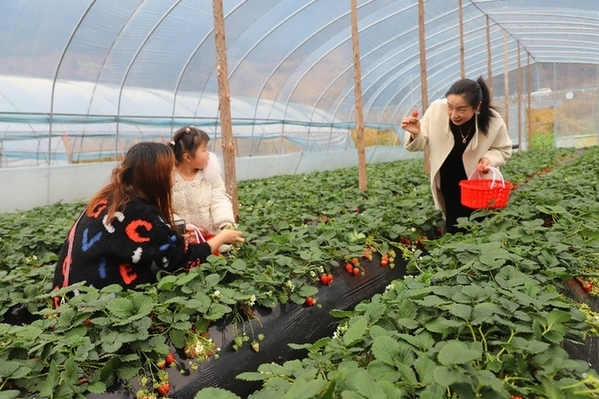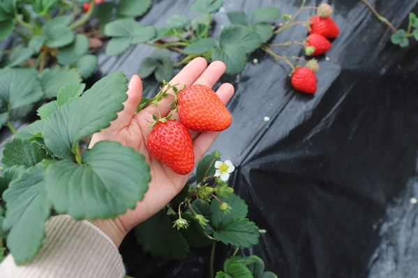 2月21日在&江縣溫泉村草莓採摘園裏,溫暖濕潤的空氣中馥鬱的草莓香味鋪面而來,一壟壟翠枝綠葉的草莓枝上映着潔白如雪的小花,熟透的草莓成深紅色,好像一顆顆油亮的瑪瑙,十分誘人。