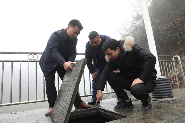 農業農村部環境保護科研監測所專家正在查看無動力污水處理系統。 (彭郡攝)