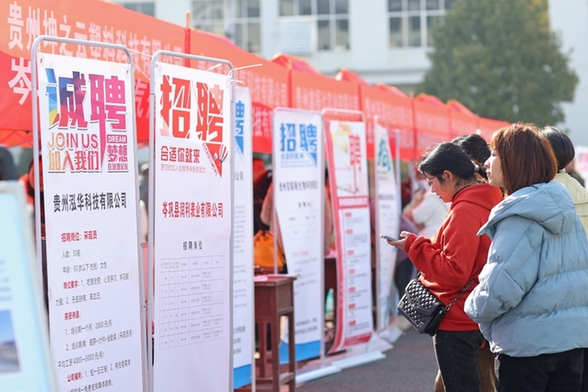 岑鞏縣2023年“春風行動”暨東西部勞務協作招聘會現場,求職者在查看合適的招聘崗位。(唐鵬 攝)