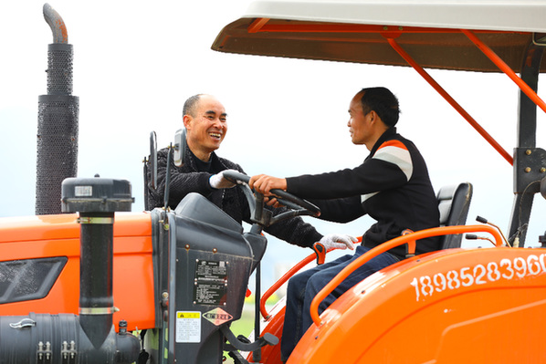 在老農機手的潘盛彬指導下,第一次學習駕駛旋耕機的麻明峰興奮不已,控制把桿、調整耙位,一會兒工夫便熟練操作了起來。