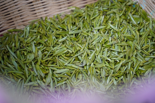 “我們只採一芽一葉的嫩茶,最先採摘的是最頂端成熟的嫩芽部分,就是頭茶。”許丹是天馬鎮有8年採茶齡的茶農,她告訴筆者,今年的茶葉生得晚,但是質量比往年都要好些。談話間,許丹動作不停,鮮嫩的茶尖隨着她熟練的雙手,在竹簍和茶樹之間來回“穿梭”。“現在鮮葉36元一斤呢,得趕緊採!”她笑着説。