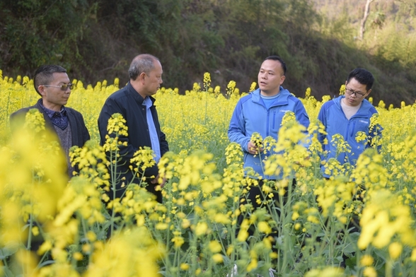 3月13日,農技人員在岑鞏縣思旸鎮盤街村油菜種植基地作技術指導。(唐鵬 攝)