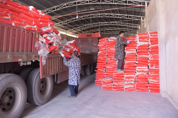 3月13日,工人在岑鞏縣供銷社農資倉庫搬運複合肥。(唐鵬 攝)