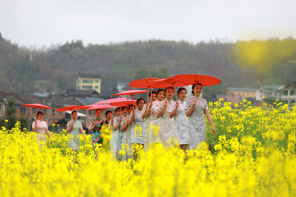 身着旗袍的游客在油菜花田裏款款而行。楊家孟攝
