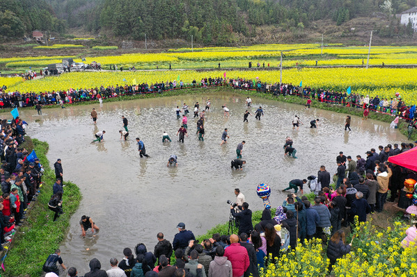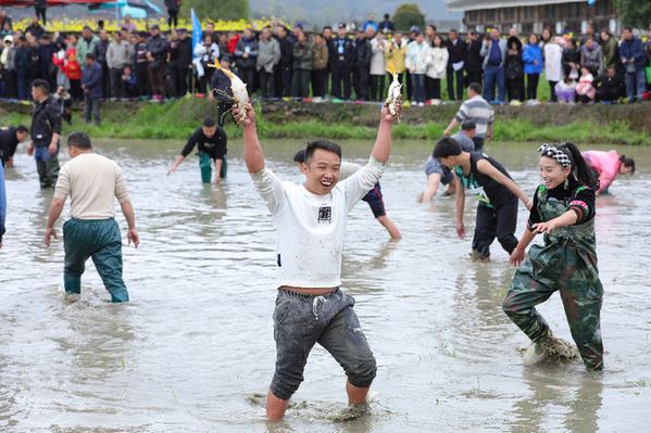 徒手捉魚抓鴨環節是最受游客歡迎的,手腳靈活的參與者收穫滿滿。“我今天抓得了兩隻鴨子五條魚,很開心。”舉着抓到的鴨子,游客潘曉狄激動地説。