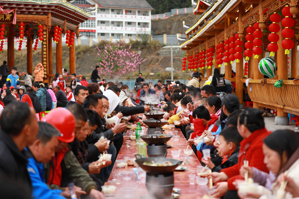 在油菜花中吃長桌宴是此次活動的一大亮點,數十米的長桌嵌在油菜花田間,游客既能在美景中嘗美食,還能在美食中品花香,好不愜意。