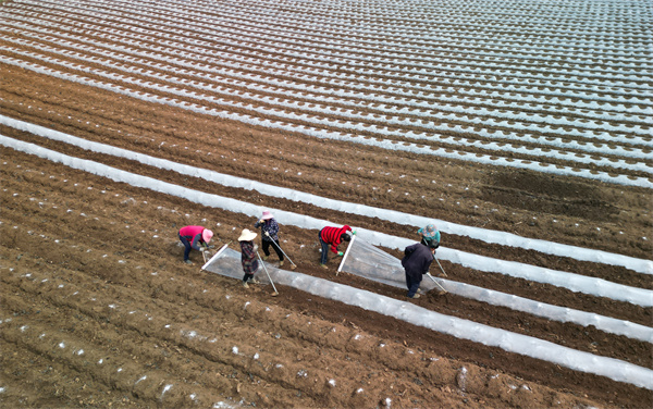 3月16日,大方縣東關鄉羅寨社區烤煙基地工人們正在覆膜。司玉坤 攝