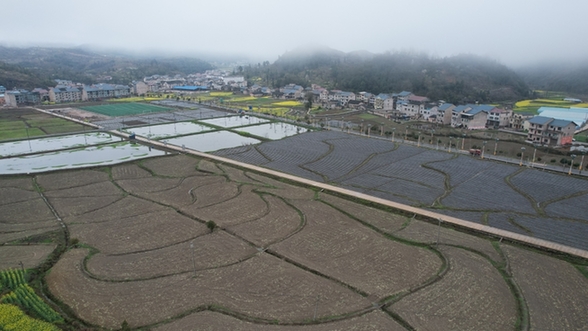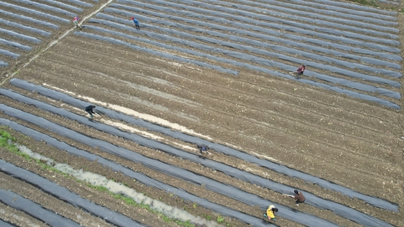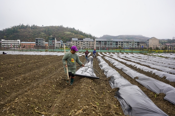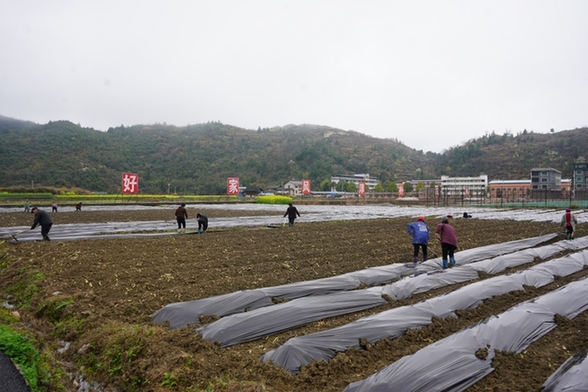 在岑鞏縣客樓鎮羅家壩壩區,10余名村民正搶抓節令,加快起壟覆膜。(吳國明 攝)