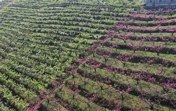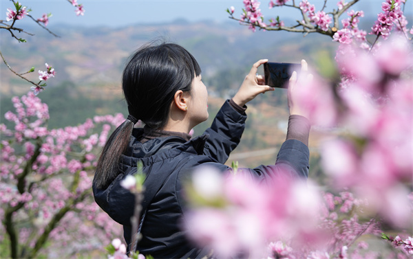 3月23日,在貴州省大方縣貓場鎮長沙村的侯氏花果山上,滿山的桃花、梨花、李子花迎春綻放,吸引了周邊縣區的游客前來游玩打卡。