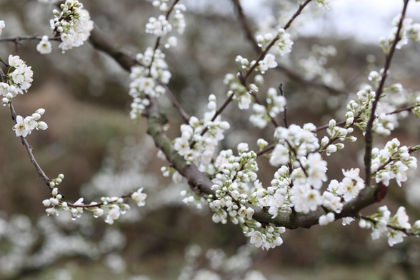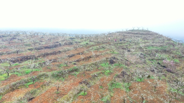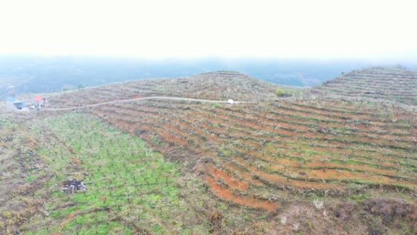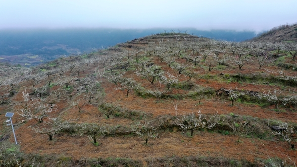 清晨,貴州省岑鞏縣平莊鎮路溪河村霧鎖山頭,位於山頂的李子園裏,連片李花在雲霧間迎春綻放,一簇簇綴滿枝頭,一朵朵似霜如雪,産業路與花海雲霧和諧交融,景色唯美浪漫。果園的主人楊繼勳操作着微耕機,正和工人們一起松土、除草。