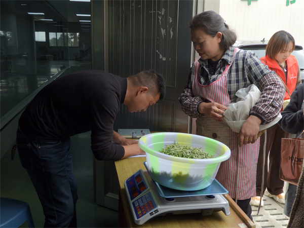 採摘結束後,大家帶着自己的採摘成果到茶場車間進行稱重計費,拿到工錢的村民們高興得合不攏嘴。