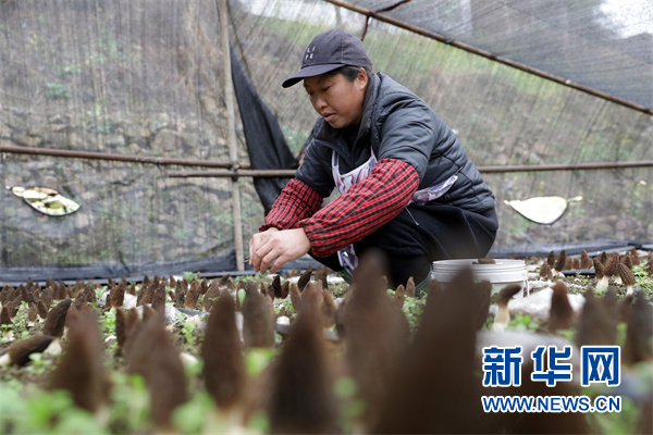 新華網貴陽3月31日電 春日時節,暖風和煦,貴州省畢節市七星關區梨樹鎮小屯溝村的羊肚菌種植基地生機盎然,朵朵羊肚菌如雨後春筍般破土而出,不少村民正拿着剪刀、提着小桶,小心翼翼地採摘成熟的羊肚菌。