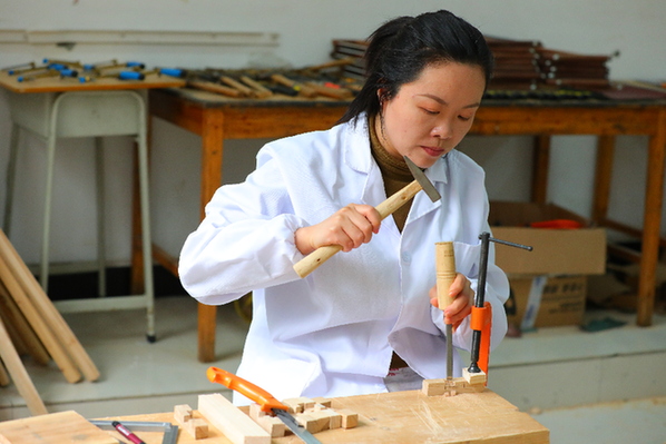 “首先找好這個隼孔的位置,留三毫米左右,定好後,我們要鑿一錘下去……”教師潘承靜一邊講解,一邊指導學生製作魯班鎖。每次教學生新物件前,她都要反復試驗幾次,再把經驗分享給學生。