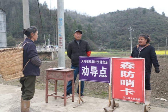 岑鞏縣天馬鎮杜麻村執勤點,值班護林員向村民宣傳森防知識。(沈啟照 攝)
