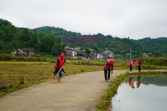 岑鞏縣天馬鎮杜麻村,黨員、保潔員、護林員等在清掃路面。(陳昆 攝)