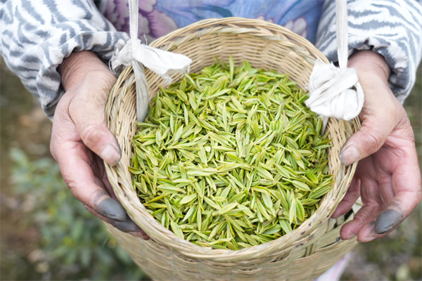 茶農們忙碌着穿梭於茶園中,手法嫻熟地將一顆顆飽滿的嫩芽輕輕摘下,收入竹籃。連片的茶山把大地染成了綠色,一派生機盎然的景象。