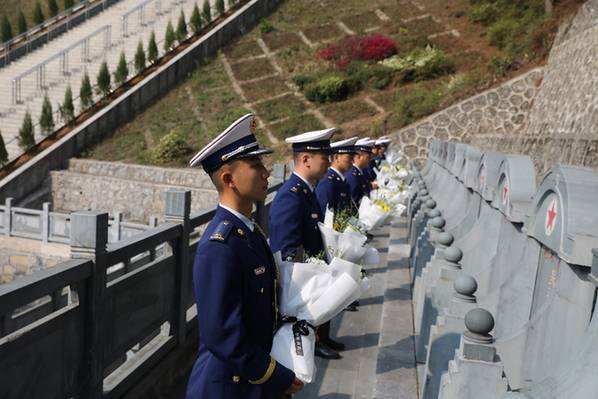 在劍河縣革命烈士陵園內,消防員向革命烈士敬獻鮮花。(楊潔茹攝)