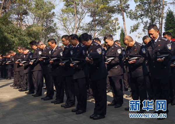 全體民警、學警向公安英烈脫帽致哀。新華網 李濤濤 攝