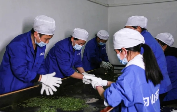 山上採茶忙,山下制茶香。都勻毛尖具有色澤翠綠、條索捲曲、香氣清澈的特點,為了確保茶葉的品質,每天從山上採摘的新鮮茶葉,當天晚上就要進行加工製作。在都勻市勻山茶葉有限公司制茶車間內,機器轟隆隆地響着,40多名制茶師傅也在各自的崗位上忙碌着。