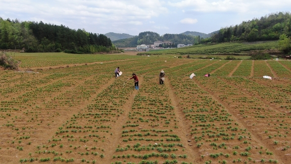 在岑鞏縣天馬鎮白岩坪村百合種植基地,村民們正在給百合施肥。(吳啟萍 攝)